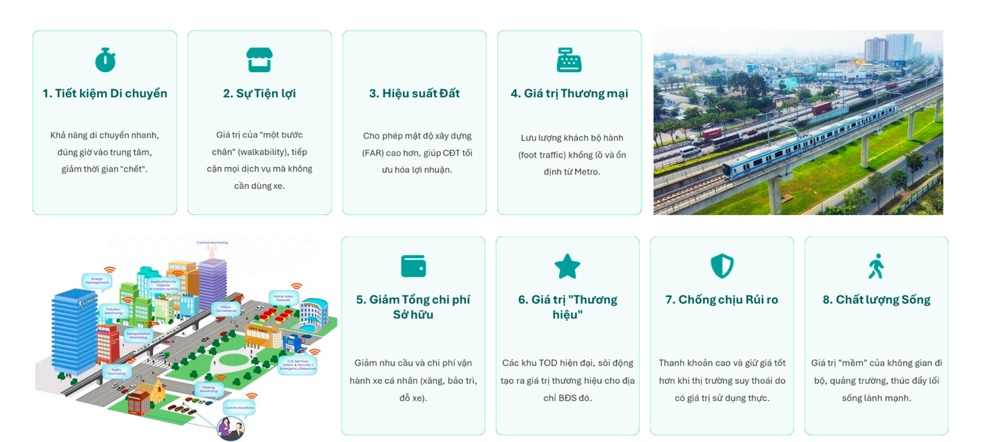 Theo nghiên cứu của CBRE Việt Nam, các dự án bất động sản nằm trong vùng ảnh hưởng của TOD, thường có giá trị cao hơn so với các khu vực khác. Đặc biệt, những dự án có tuyến metro đi ngang nhà có sự biến động về giá rõ nét nhất trong suốt thập kỷ qua.
